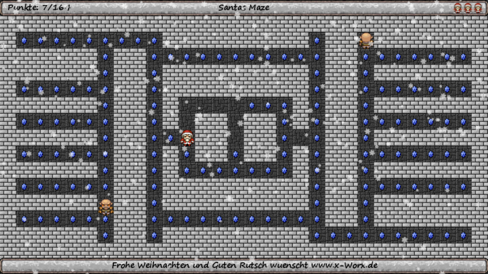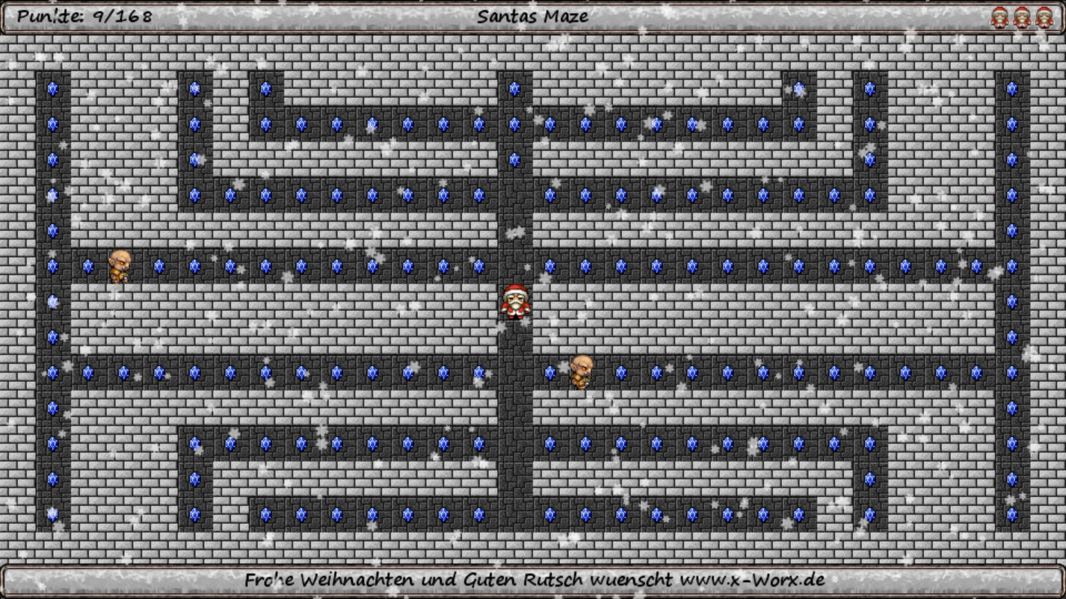 Helft Santa aus den Labyrinthen zu entkommen. Achtet auf die bösen Oger, herumfliegende Pfeile und den Mad Santa Geist der durch die Labyrinthe irrt. Sammelt alle Punkte in einem Labyrinth, bis das Geschenk erscheint. Sammelt das Geschenk ein und ihr habt das Labyrinth geschafft.